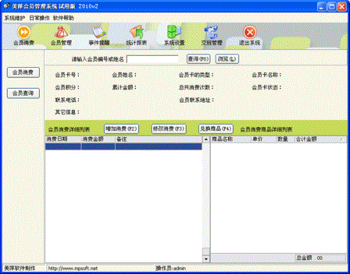 会员消费:对会员消费情况进行录入,自动完成累计积分,消费打折。也可以增加会员消费商品的详细信息。