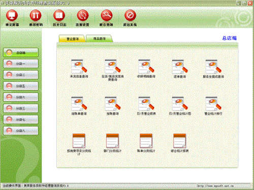 美萍服务类软件系统连锁店版采用先进的VPN技术及虚拟专用网进行安全连接,实现领导层实时进行各分店的营业情况进行查询分析。支持设置多个分店,领导层只需点击相应分店,即可查询对应分店的实时营业情况,此查询系统分为三大模块: