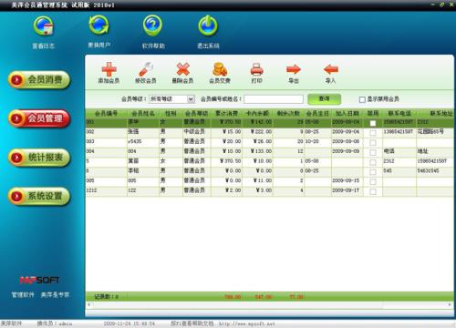 会员消费:对会员消费情况进行录入,根据会员等级自动完成累计积分;可以增加会员消费项目的详细信息;也可以进行添加、修改会员操作。